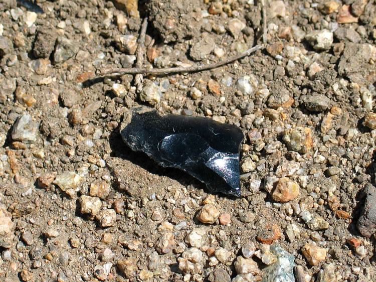 We also begin to see worked flakes of obsidian, remnants from the earlier inhabitants and creators of the rock art that we're seeking.