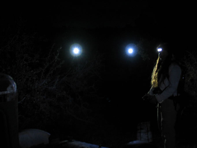 By now it's pitch black. As we hike off to find our vehicles we look like a bunch of fireflies!