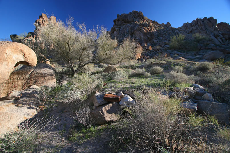 Last time, after finding the ruins of the upper tram tower, we surmised that it must have run down from the notch in the hill in the background to a lower terminal in the valley below. Here are the stacked rock foundations for what was most likely the lower tram terminus.