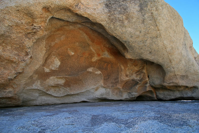 Under the overhang of a weathered niche in a large boulder is a small pictograph panel.