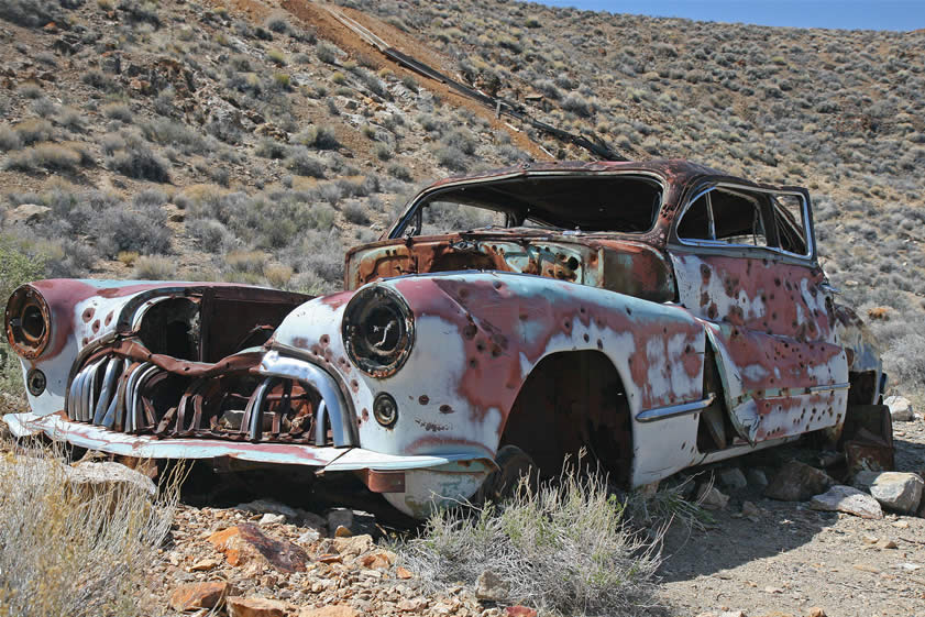 This colorful hulk of a behemoth Buick provides a great foreground to the metal lined ore chutes seen above its roof.