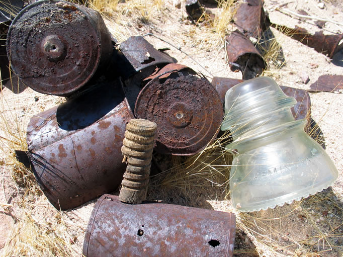 In this photo there are not only some soldered top cans, but also a Hemingray insulator and wooden insert. The Hemingray in this photo was produced in 1936 from a master mold made in 1934. The following site gives detailed information on dating Hemingray insulators.