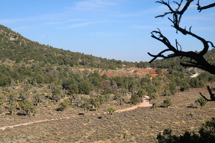 This view looks back at the reddish tailings from the Rose Mine. Also, you can clearly see the Joshua trees mingled with the pines here.