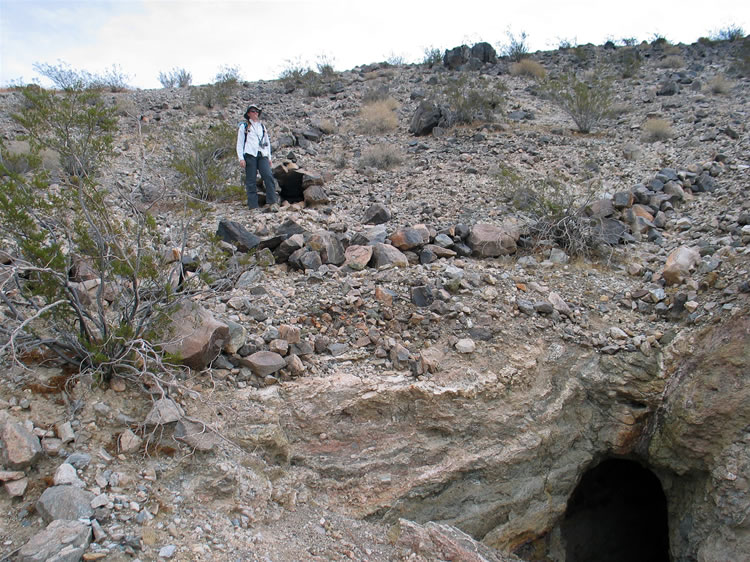 Niki next to a large claim marker cairn above one of the shallow tunnels.
