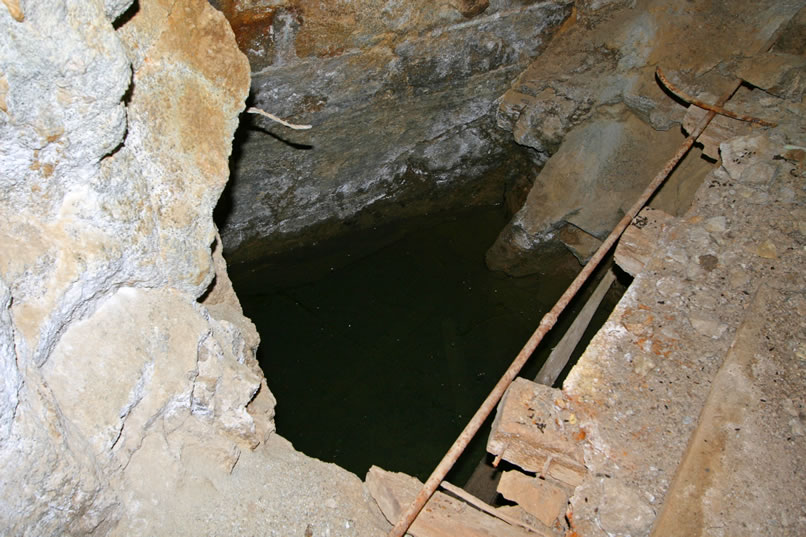 A closer look at the water filled shaft. The water is so clear that our headlamp beams pierce through it revealing drowned timbers far below the surface.